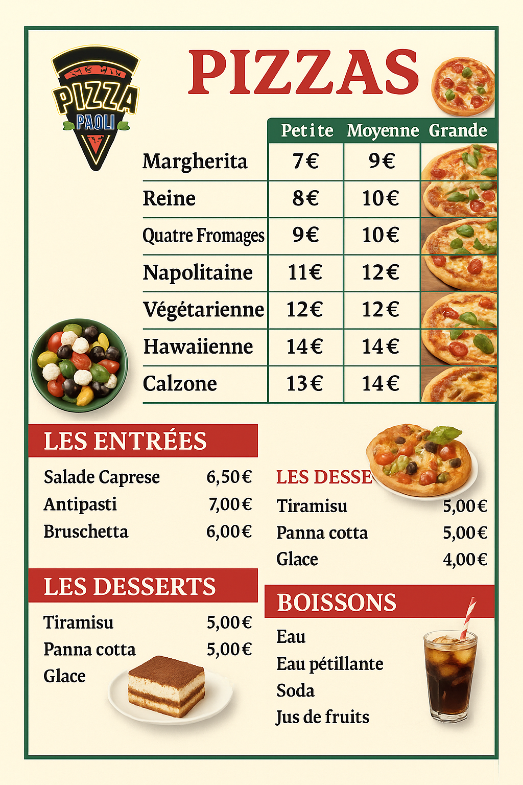 Chez Pizza Paoli, nous travaillons des ingrédients frais et locaux pour des pizzas croustillantes et savoureuses. Sur place, à emporter ou en livraison, découvrez nos recettes classiques et créations maison.